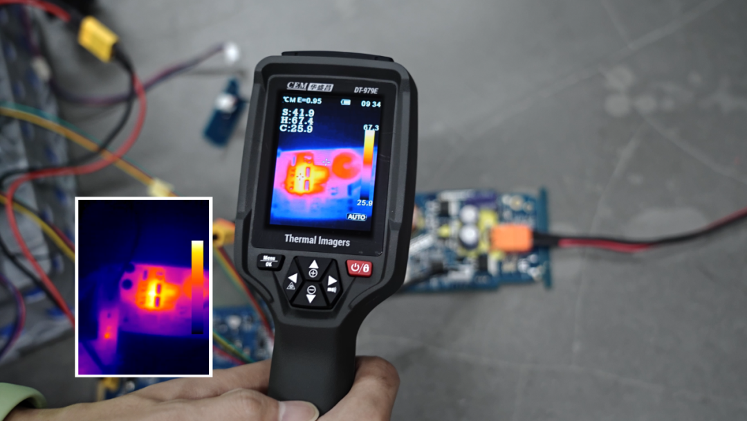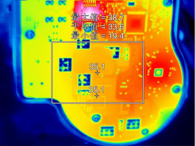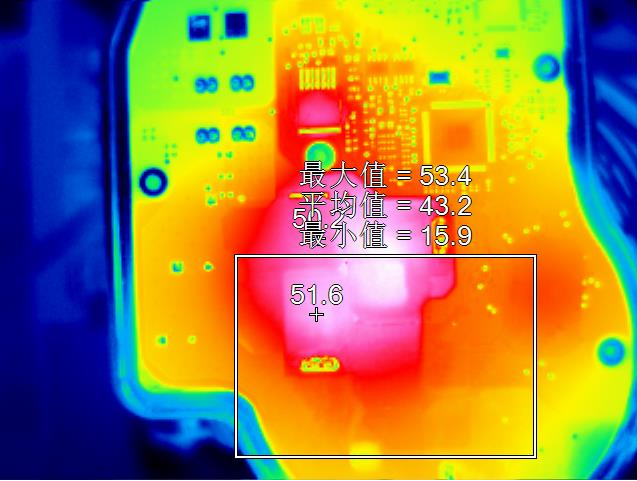 使用紅外熱像技術對PCB電路板進行發(fā)熱測試。下圖為PCB電路板的發(fā)熱情況測試,需要觀測PCB電路板表面的溫度分布情況,來確認是否處于工作溫度內(nèi)。