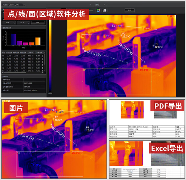 Thermview Pro的在線實時分析視頻的功能,能現(xiàn)場拍照,也能將設備上已拍照片同步至軟件,還能對紅外圖像進行及時編輯、調(diào)整、分析、融合乃至PDF報表的導出,打破了用戶使用軟件時的物理場所、空間的局限性。加上該軟件編輯界面支持3倍以上的放大分析及查看功能,有利于用戶對熱成像目標進行更為準確的觀察與分析。